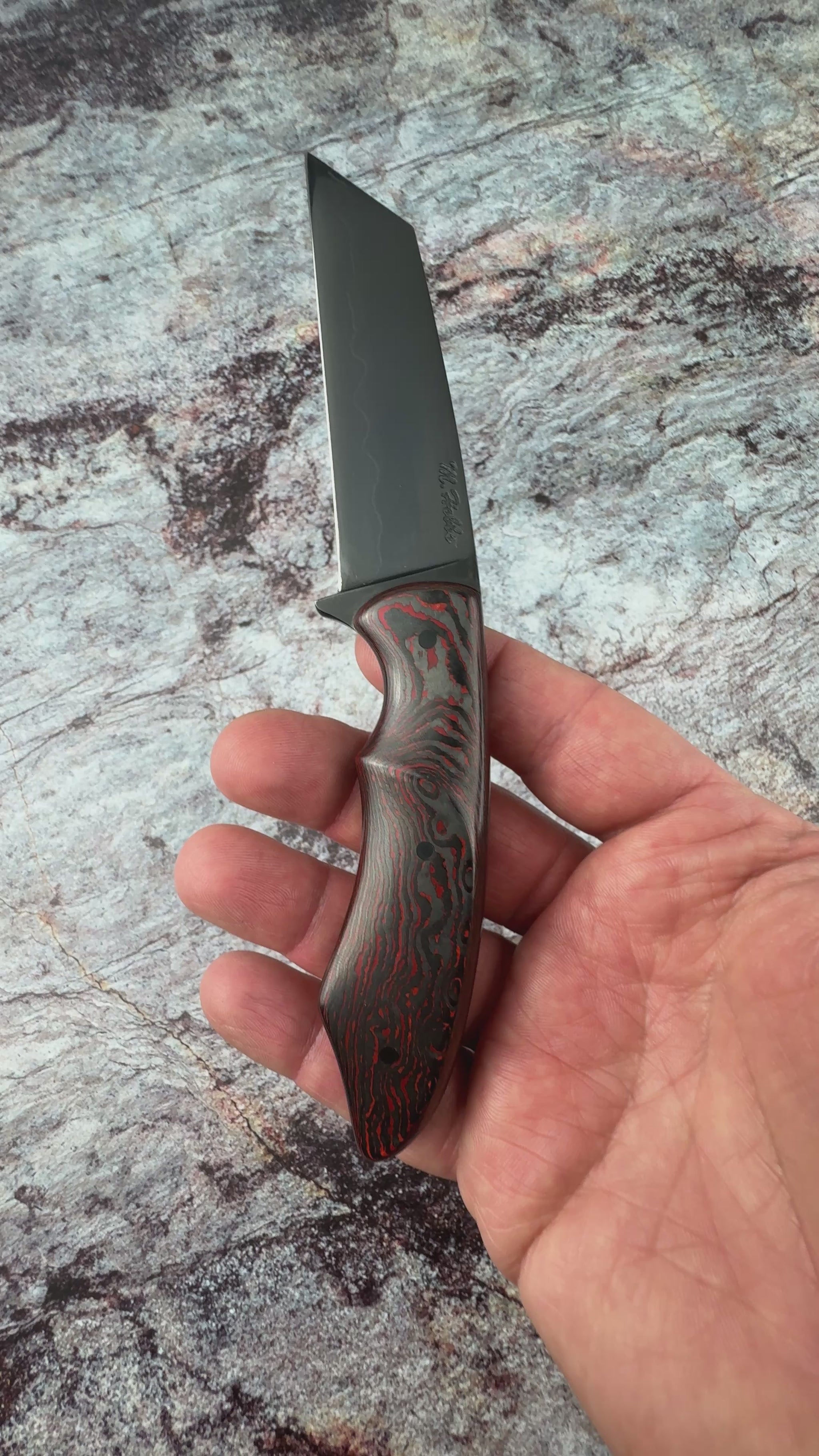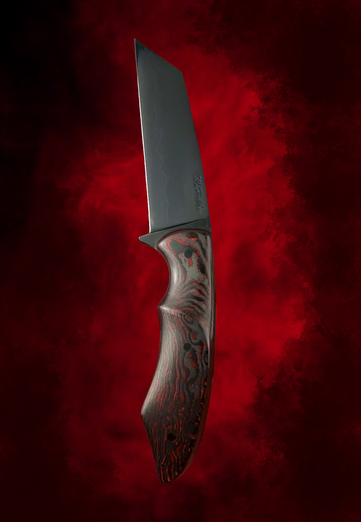 Bad Sheep—a knife engineered for precision, control, and reliability in any situation. With its distinctive sheepsfoot style blade and ergonomic design, this knife is made to perform when it matters most. And with its Black-out San Mai, tapered tang and Lava Flow Carbon Fiber, it will look good doing it!