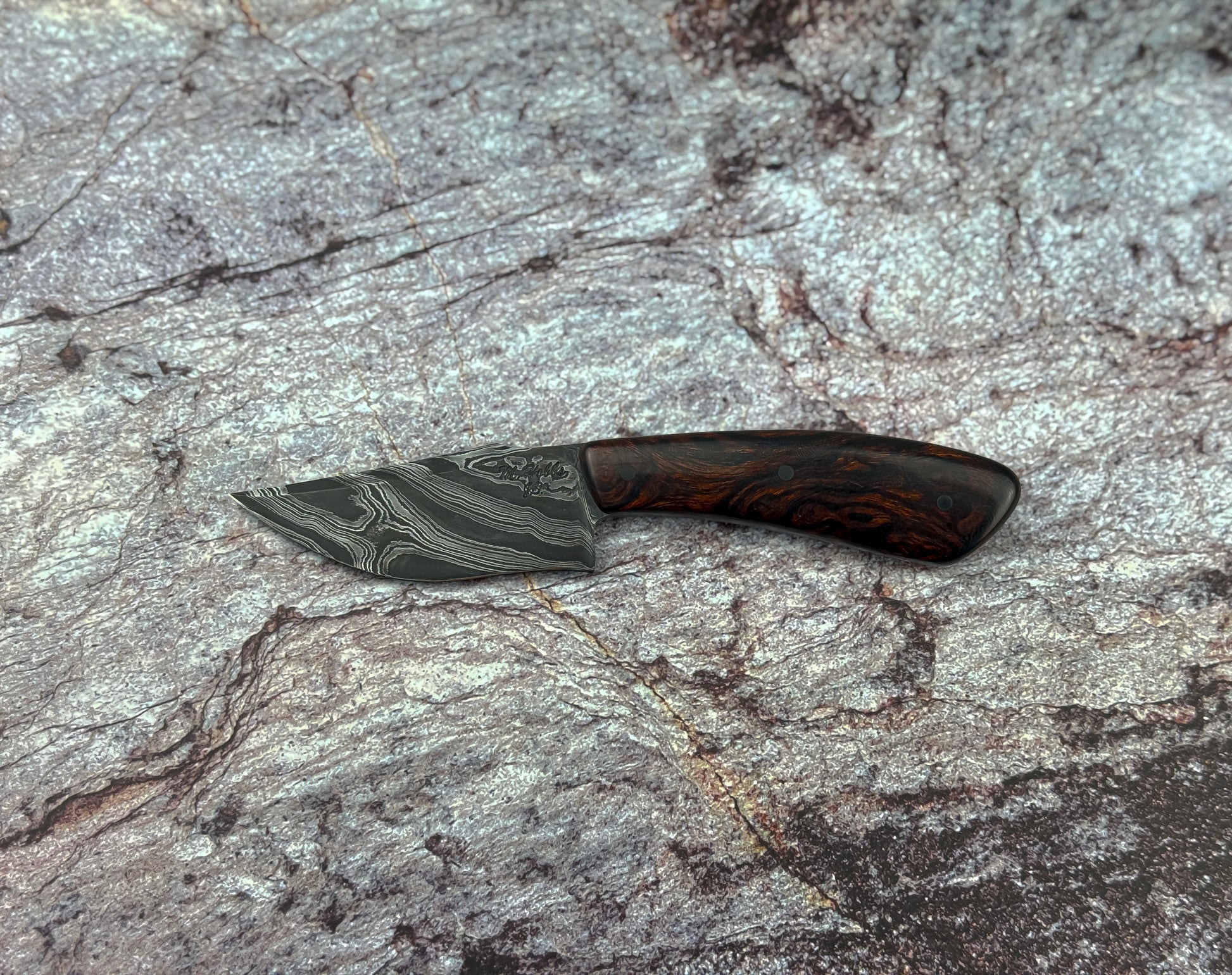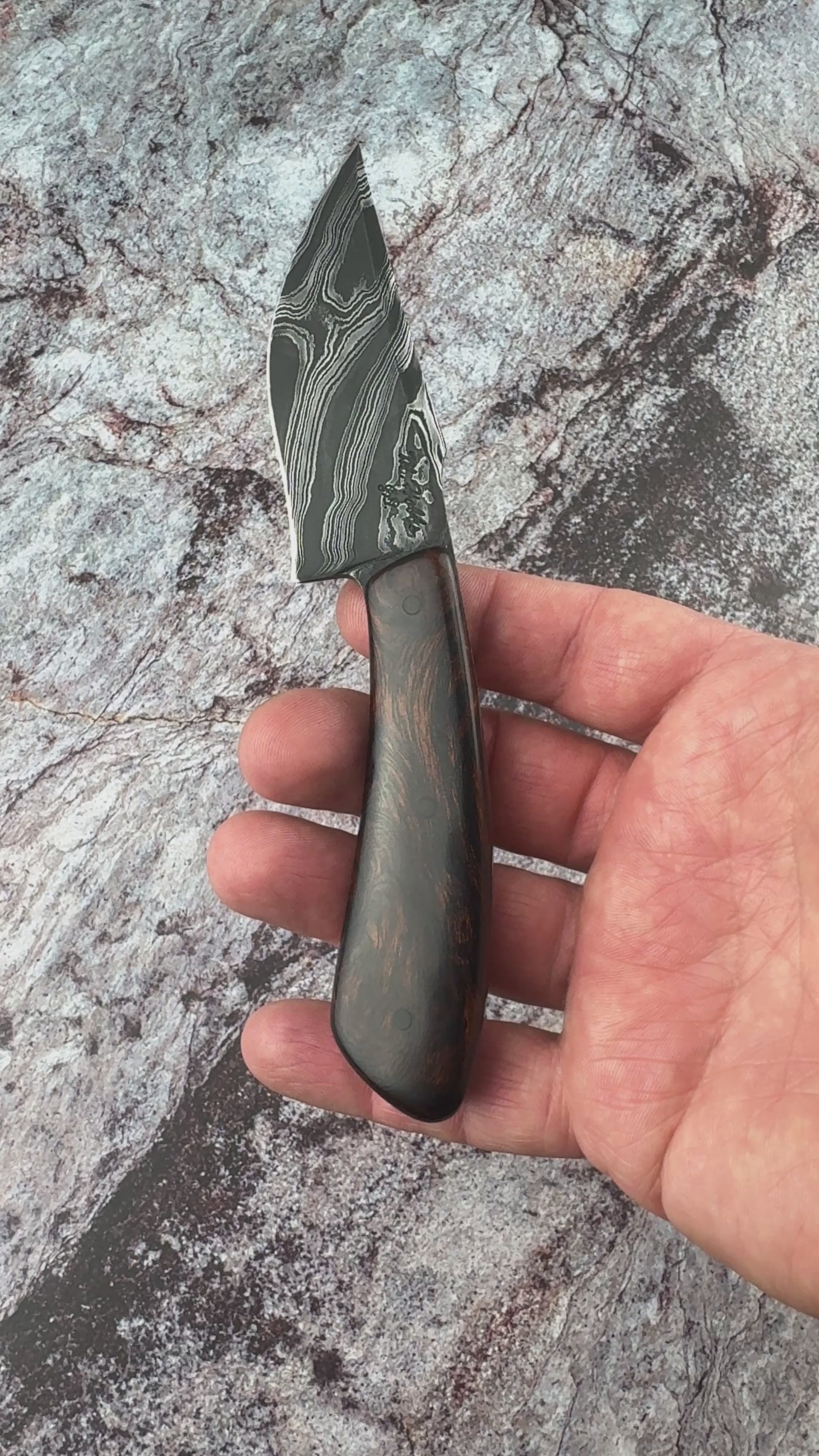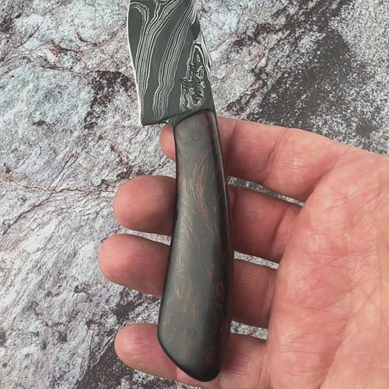 Meet Lynx, a knife that merges rustic elegance with everyday practicality. Crafted for those who value both style and functionality, this knife is perfect for daily carry while standing out with its bold damascus pattern and precision recurve blade. Sporting a "Lazy Twist" Damascus pattern blade combined with a beautiful piece of Desert Ironwood Burl to complete this stunning knife.