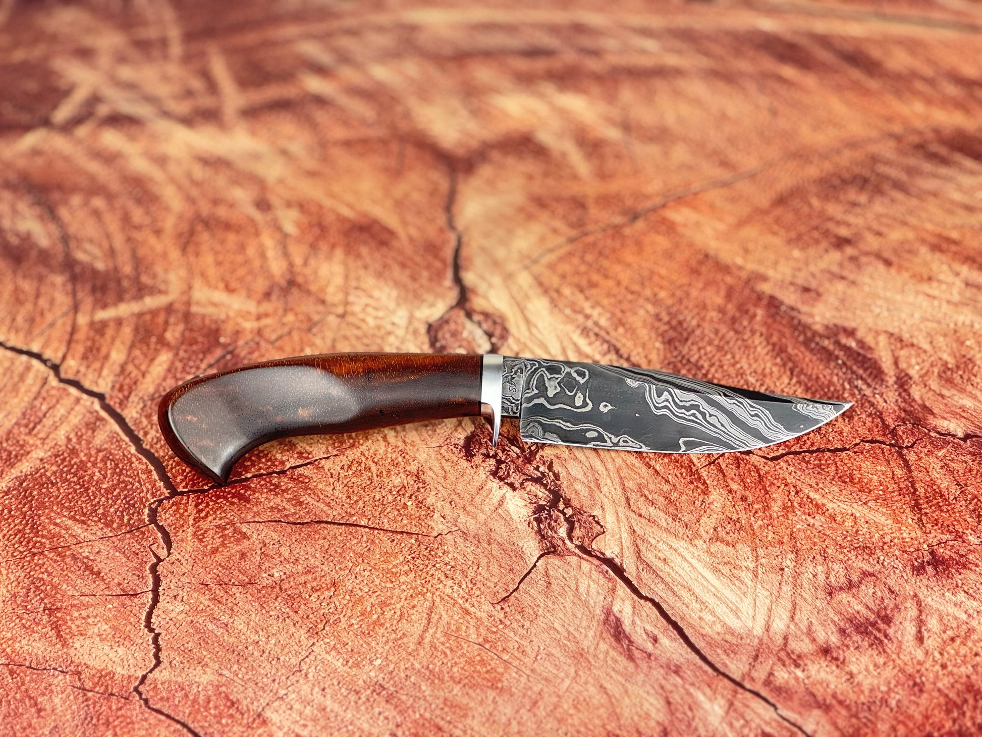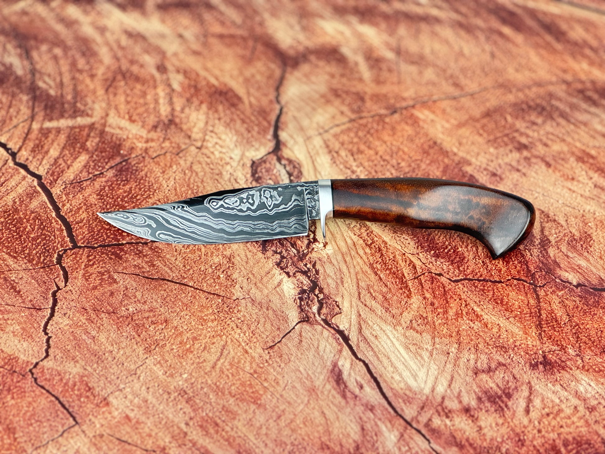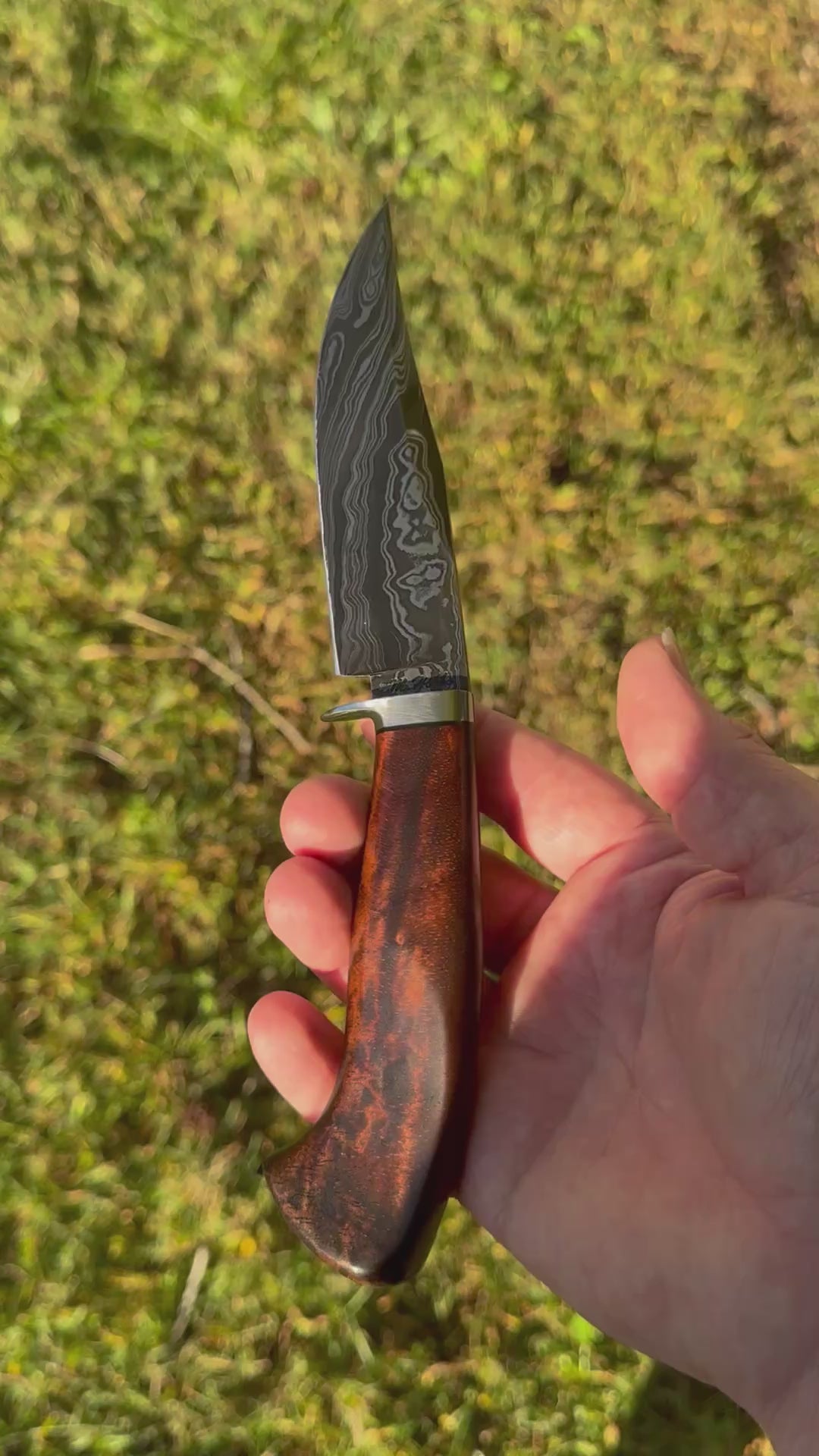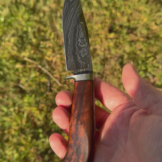 Hand-forged Lazy Twist Damascus from 80CRV2 and 15N20 steel, the 4 1/2" blade delivers exceptional sharpness, edge retention, and control—ideal for field dressing, skinning, and fine camp tasks. The elegant profile offers added slicing power without sacrificing precision, making it as practical as it is beautiful.